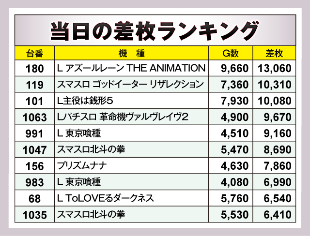 トップに輝いたのは『L アズールレーン THE ANIMATION』。180番台が+13,060枚と驚異的な成績をのこしていた。そして『スマスロ ゴッドイーター リザレクション』119番台が+10,310枚、『L主役は銭形5』101番台が+10,080枚でつづき、万枚オーバーが3台誕生する事態となっている。