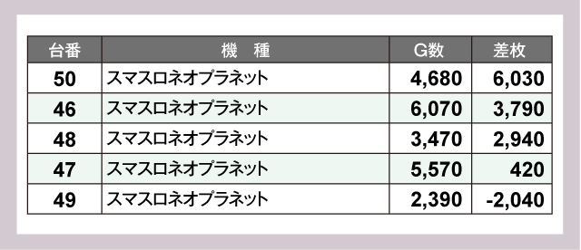 機種ごとに見てみると大量設置の『スマスロ北斗の拳』は全台が高稼働で、大幅プラスの台が多数うまれていた。『L アズールレーン THE ANIMATION』は万枚達成台の他にも優秀台が多数みられる。5台設置の『スマスロネオプラネット』と『クレアの秘宝伝 〜はじまりの扉と太陽の石〜 ボーナストリガーver.』はいずれも4台がプラスで、プレイヤー大満足の結果となった。