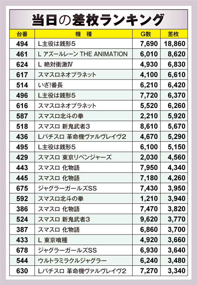 当日差枚ランキング