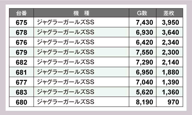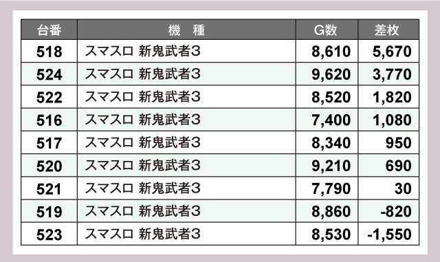 その他にも、『スマスロ 新鬼武者3』から+5,670枚、+3,770枚が発生。また、Aタイプ機種も負けてはおらず、『ジャグラーガールズSS』から+3,000枚超が2台、さらに全台がプラス差枚となる圧巻の結果を残しファンを喜ばせていた。