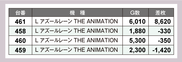店内で最も目立っていたのが『L主役は銭形5』で、494番台の+18,860枚を皮切りに+6,370枚、+5,150枚といったハイスコアを連発させプレイヤーの注目を集めていた。さらに、『L アズールレーン THE ANIMATION』の+8,620枚をはじめ、様々な機種から+6,000枚超が飛び出す盛況ぶりを見せている。