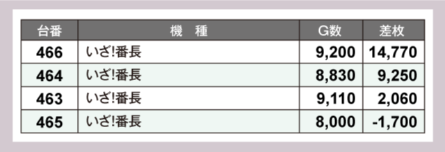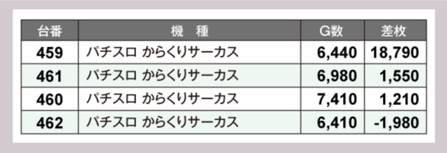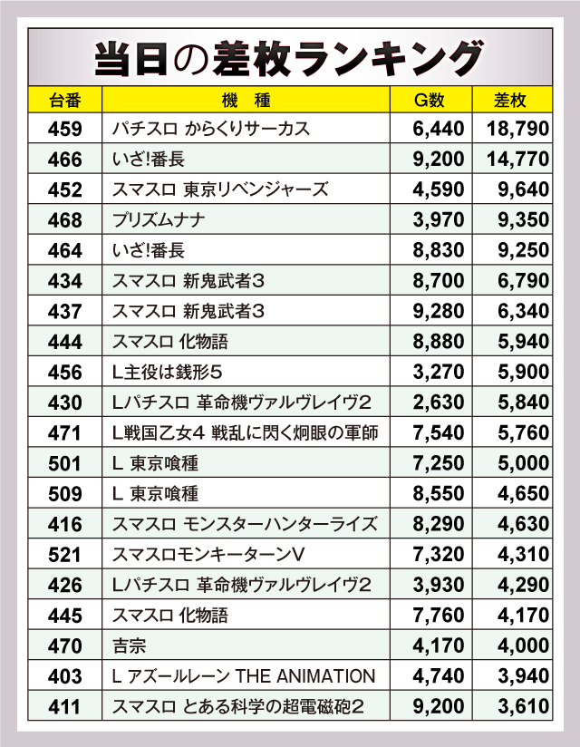 この日、最もプレイヤーの注目を集めたのが『パチスロ からくりサーカス』で、459番台が怒涛の+18,790枚を叩き出し堂々のランキングトップに。続く『いざ!番長』も万枚超を達成、さらに『スマスロ 東京リベンジャーズ』と『プリズムナナ』から+9,000枚超が飛び出す盛況ぶりを披露している。