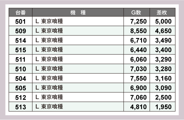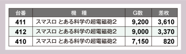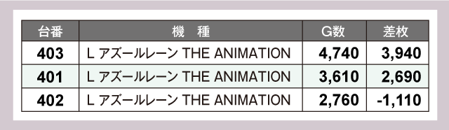 また、その他にも『L 東京喰種』は+3,000枚超が8台も発生。そして、『L アズールレーン THE ANIMATION』は全3台中2台、『スマスロ とある科学の超電磁砲2』は3台全てがプラス差枚となる見事な結果を残しており、それぞれのシマは常に活気に満ち溢れる一日となった。