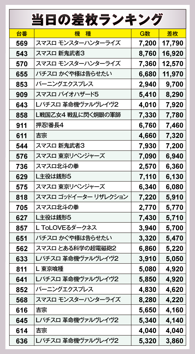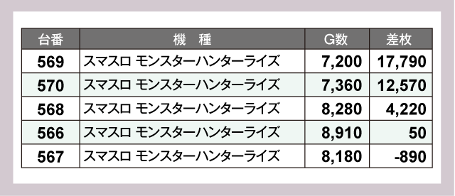 とくに目立っていたのは『スマスロ モンスターハンターライズ』。569番台が+17,790枚、570番台が+12,570枚と類まれなる出玉性能を発揮していた。そして『スマスロ 新鬼武者3』543番台が+16,920枚、『パチスロ かぐや様は告らせたい』655番台が+11,970枚と、計4台が万枚オーバーを達成している。