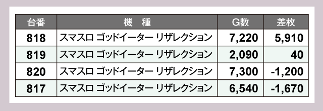 機種ごとに見てみると、ランキング上位を賑やかした『スマスロ モンスターハンターライズ』はもちろん、『スマスロ ゴッドイーター リザレクション』と『L主役は銭形5』からも誰もがうらやむような優秀台が誕生していた。『スマスロ マギアレコード 魔法少女まどか☆マギカ外伝』は全台が高稼働だったが結果がともなわず、次回以降に期待したいところだ。