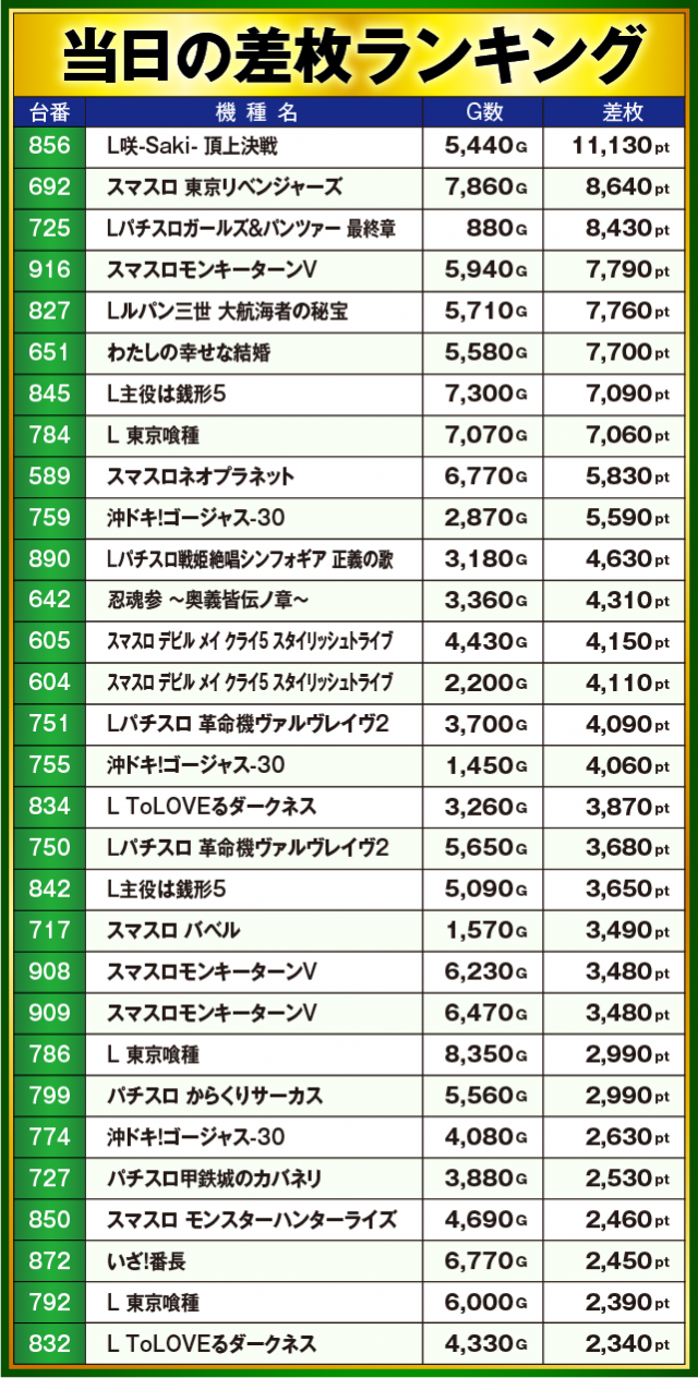 ※差枚数順に掲載しています
