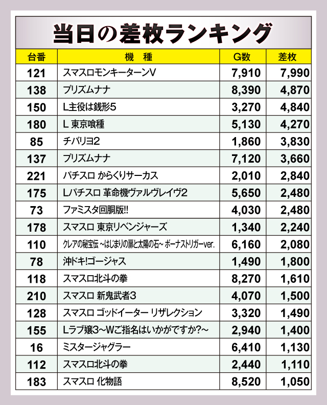 まずは全体のランキングを見ていこう。トップに君臨した「スマスロモンキーターンV」が差枚+7,990枚という絶好調の記録を叩き出し、店内のボルテージを一気に最高潮へと押し上げた。それに続いたのが「プリズムナナ」の+4,870枚、「L主役は銭形5」の+4,840枚と、多種多様な機種が輝きを放っていたのが鮮烈だ。さらに「L東京喰種」などの人気機種も軒並み好成績を残しており、ホール全体が凄まじい熱気に包まれていた事実は疑いようがない!