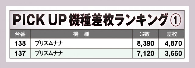 続いてピックアップ機種に焦点を当てよう。今回は「プリズムナナ」が主役級の活躍を見せ、ランキング上位にも食い込む素晴らしい結果を残した。特筆すべきはその回転数だ。ピックアップされた2台は、差枚もさることながら、それぞれ8,390G、7,120Gと高稼働。これは遊技していたファンが「この台は間違いない」と確信を持ってレバーを叩き続けた何よりの証しと言っていいだろう。遊技していたファンは至福の時間を過ごしていたに違いない!