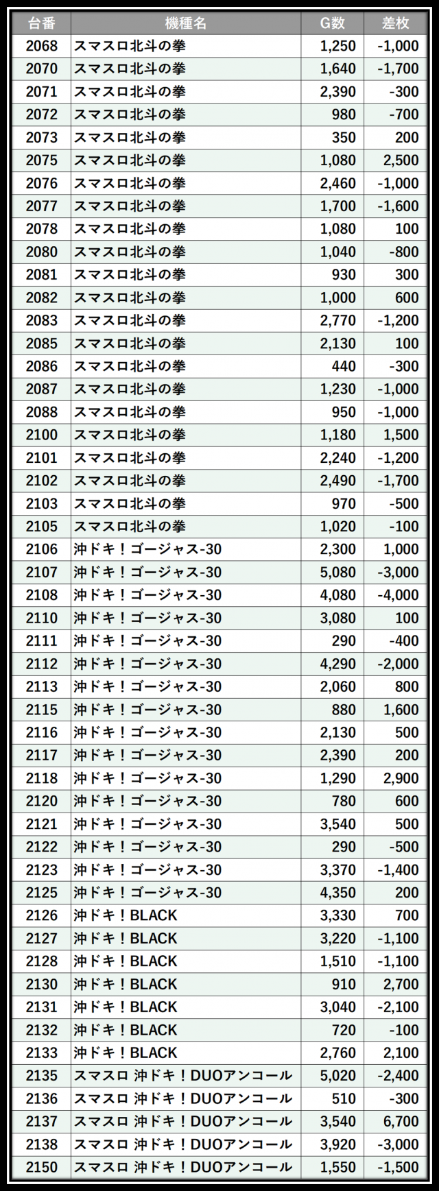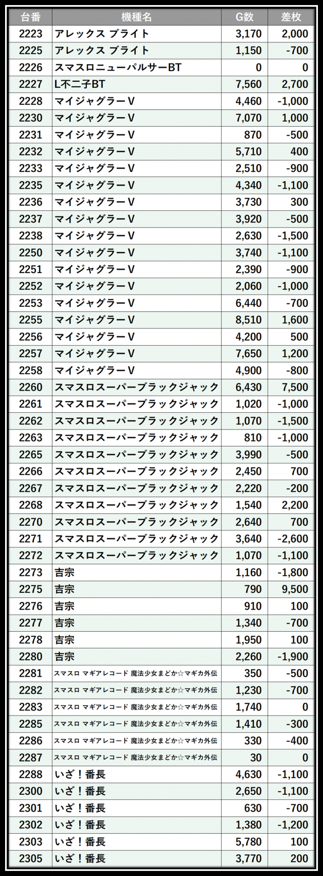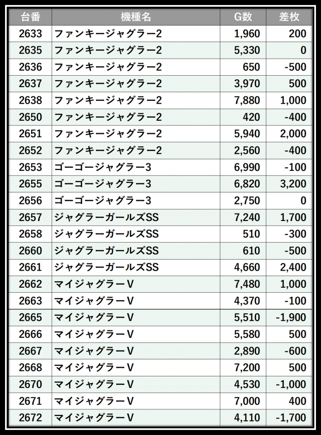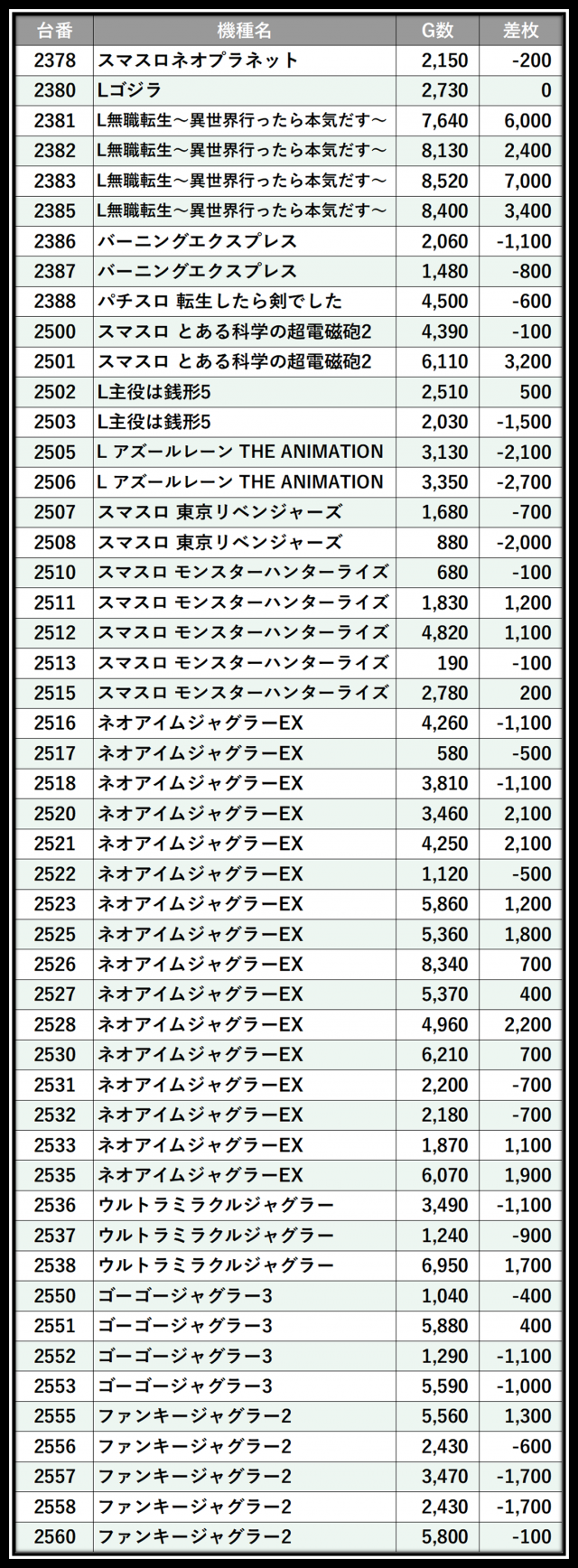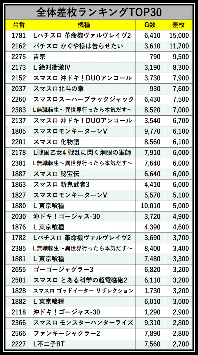 ※差枚数順に掲載しています