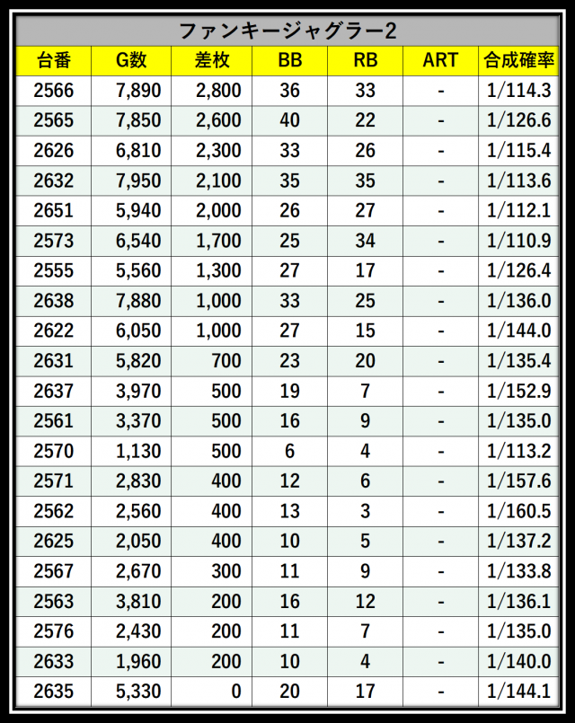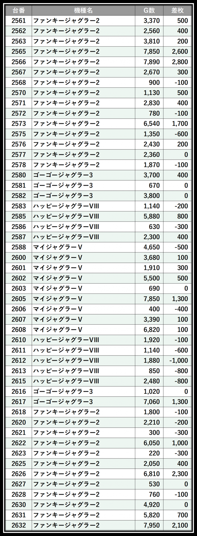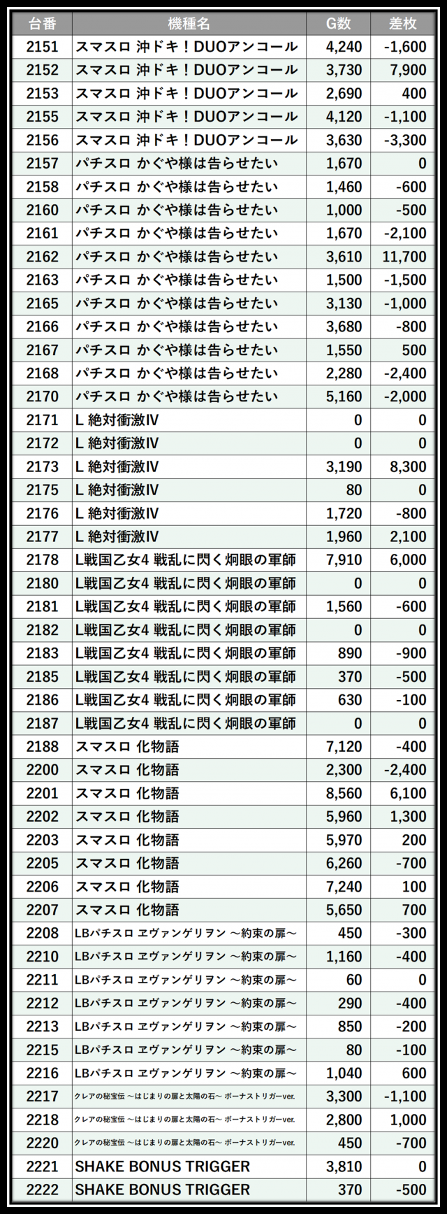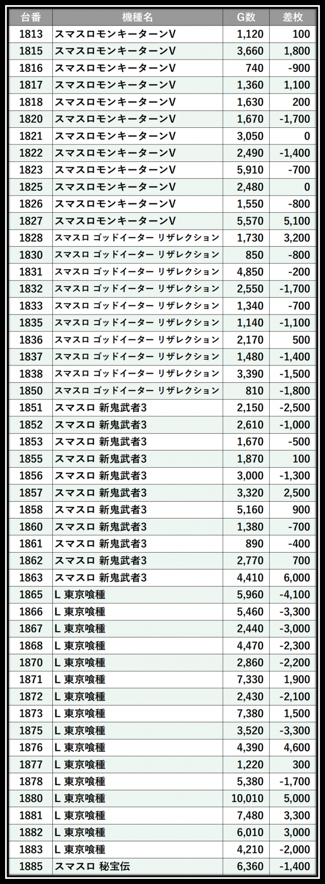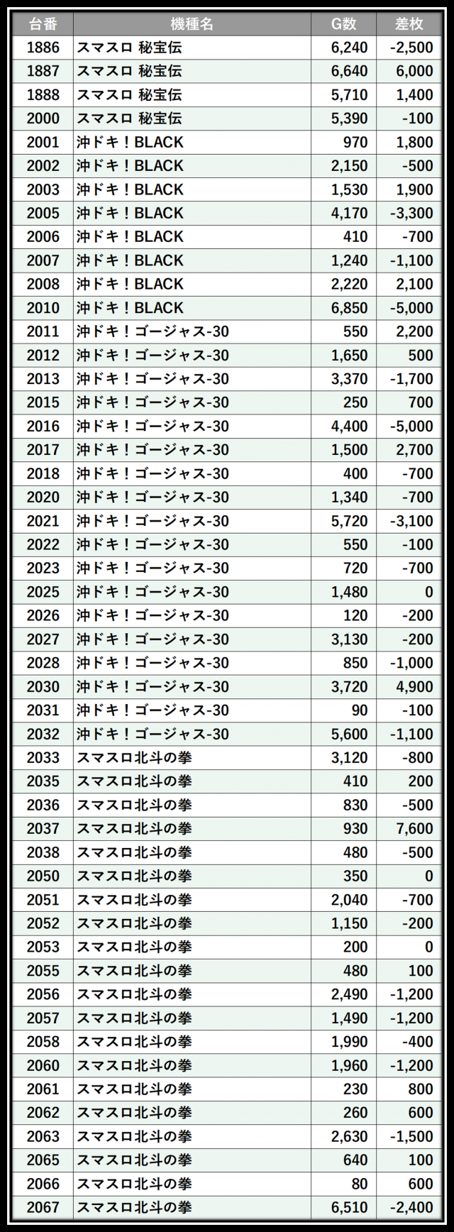 ※差枚数順に掲載しています