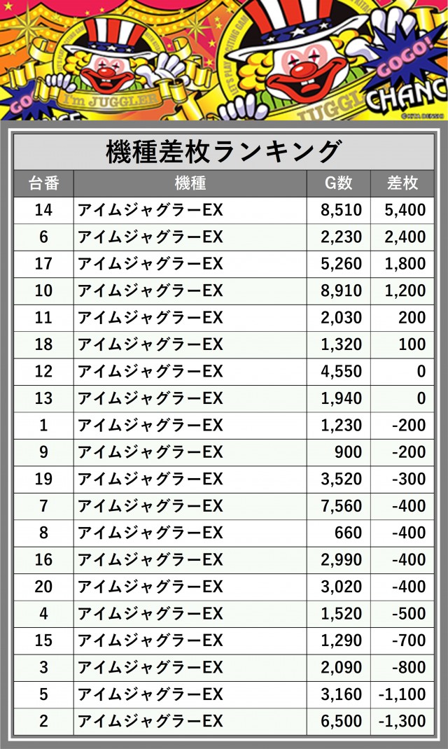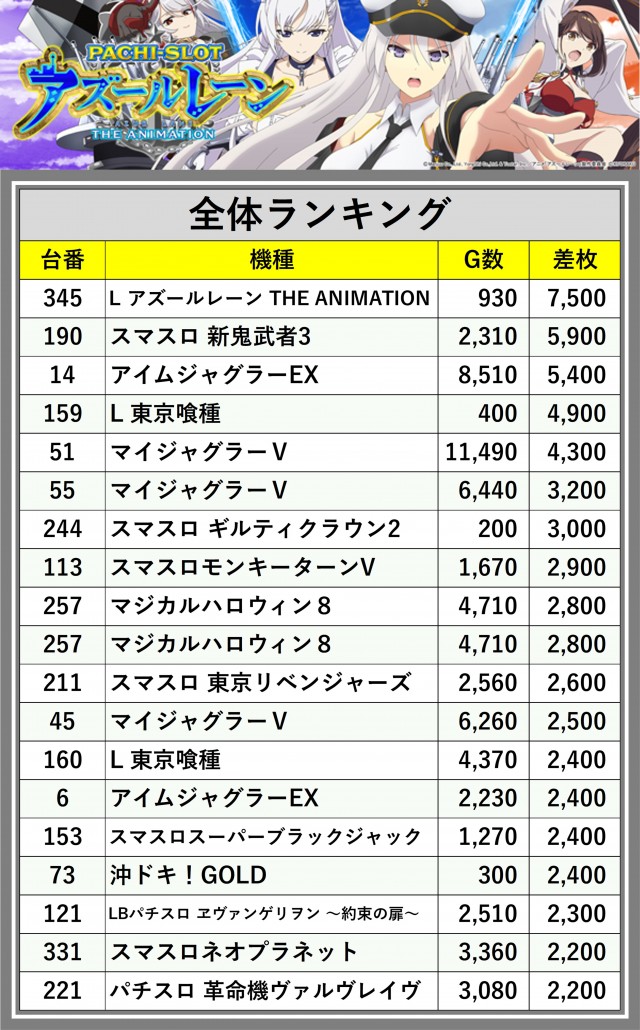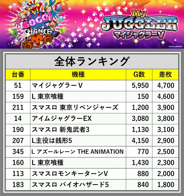 厳選された取材対象機種をはじめ、その他スロット全体から好記録が飛び出した!プレイヤーが楽しんだ1日を下記データにて振り返ってみて欲しい。