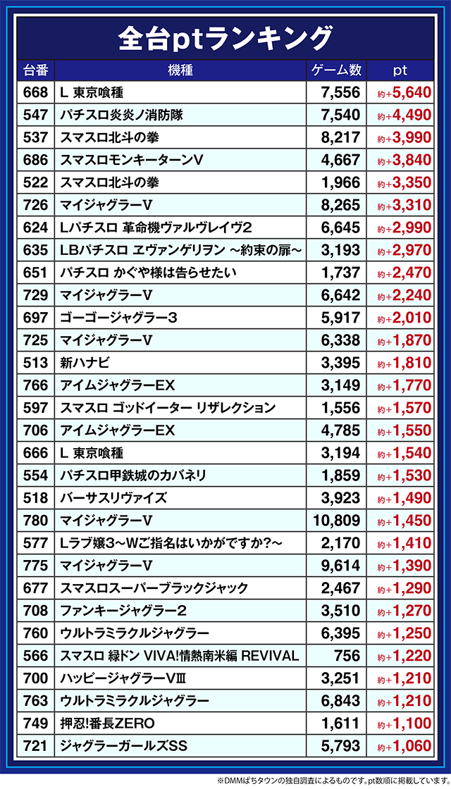 ほかにも、「スマスロモンキーターンV」の686番台や「マイジャグラーⅤ」の726番台が約+3,300ptを上回った。