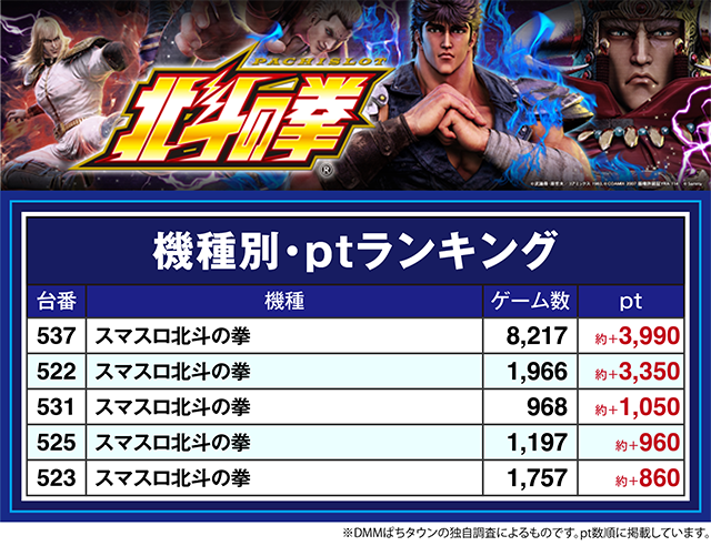 「スマスロ北斗の拳」では、537番台と522番台が約+3,300ptオーバーとなった。