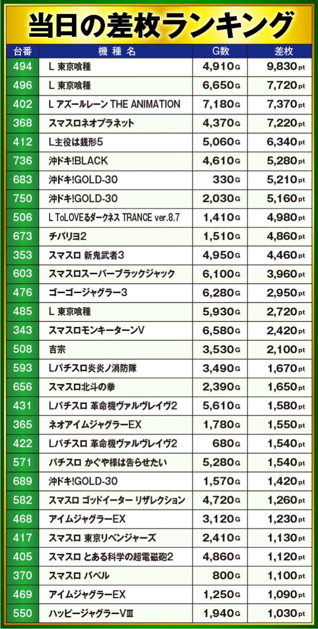 レポートの最後に「Super D’STATION大間々店」の差枚ランキングも掲載!