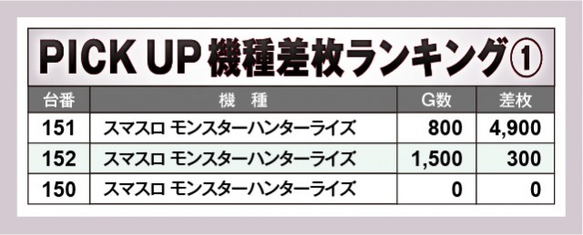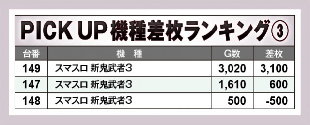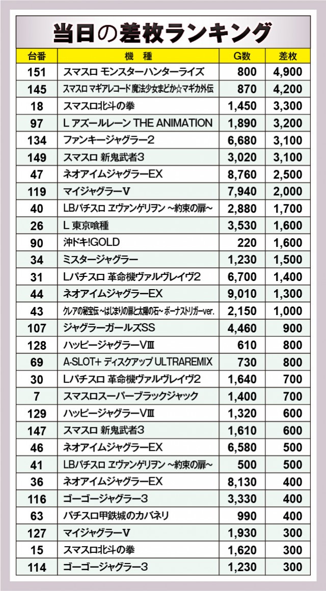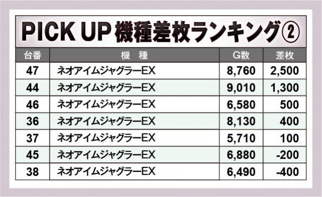 上表の3機種はほとんどの台でプラス差枚数を築いており、大きなポテンシャルを秘めていたのが分かる。特に『ネオアイムジャグラーEX』は回転数と差枚数が比例する展開を披露しており、ファンは確信を持ってレバーを叩けていたはずだ。いずれもまとまった出玉を確保している点も見逃せず、店内の盛り上がりをリードする存在になっていたのは間違いない。
