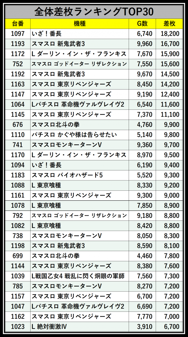「極誓取材」初開催ながら、早くもホール全体が覚醒したような展開に。とりわけスマスロ勢の伸びは圧巻で、9台もの万枚OVERが一気に飛び出し、序盤から閉店まで熱気が途切れない一日となった。中でも存在感を独占したのが『いざ!番長』の+18,200枚。コンプリート目前といえる破壊力で島全体の視線を集めていた。その勢いはランキング上位にも直結し、TOP30台がほぼ7,000枚OVERという異例のハイレベルぶりを記録した!さらに多台数の主力機種だけでなく、少数構成のスマスロでも好調台が続々と登場し、機種構成に関係なくチャンスが散らばる“攻めやすい盤面”が広がっていたのが印象的だ。初開催でここまでの出力を見せた点を踏まえると、次回の伸びしろは未知数。シリーズとしての本格始動に期待せずにはいられない!