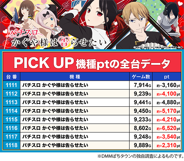 「パチスロ かぐや様は告らせたい」は6台が約+2,300ptを超え、1116番台が約+6,520pt。