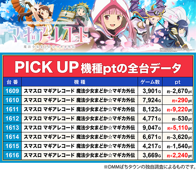 「スマスロ マギアレコード 魔法少女まどか☆マギカ外伝」でも、約+9,200pt以上となった台を確認している。