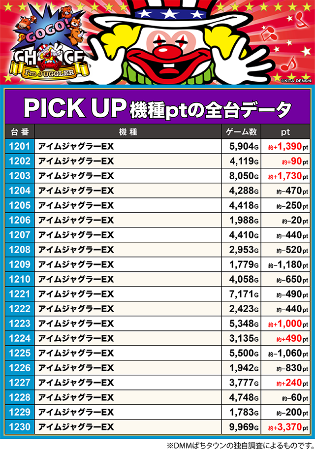 「フジコー三島店」の「アイムジャグラーEX」は、1230番台が約+3,370pt。