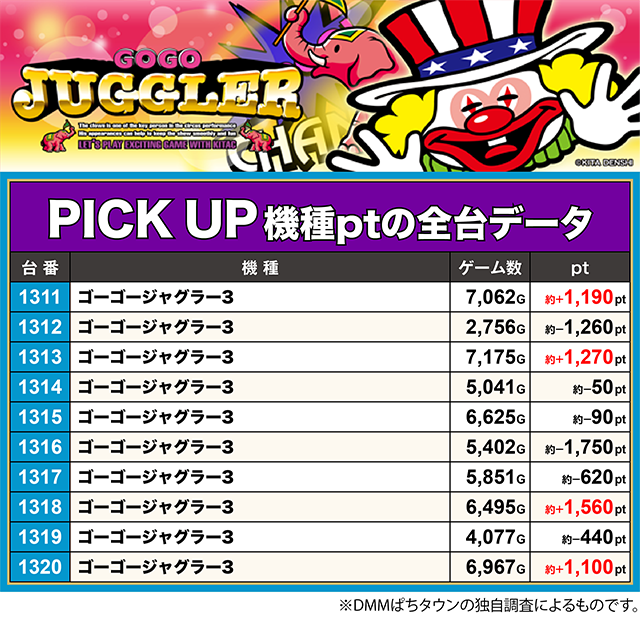 「ゴーゴージャグラー3」の1311番台や1313番台なども約+1,000ptオーバー。