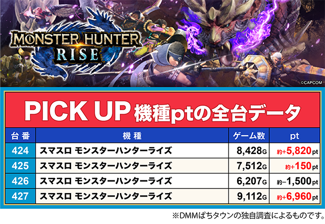 「スマスロ モンスターハンターライズ」も2台が約+5,800ptを超え、427番台は約+6,900ptオーバー。