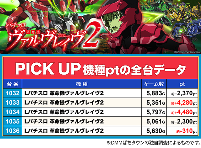 「Lパチスロ 革命機ヴァルヴレイヴ2」の1033番台と1034番台も約+4,200ptを超えた。