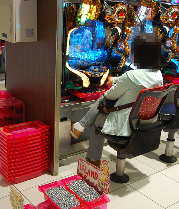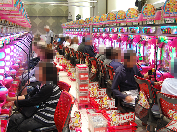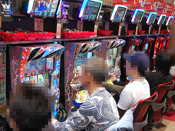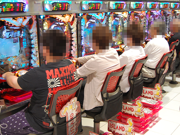14時ごろの4円パチンコにおいて、ひときわ盛り上がっていた機種が「CRスーパー海物語IN沖縄4」。機種の性能を最大限に引き出すプレイヤーが多く、シマ全体に華々しい光景が広がっていた。
