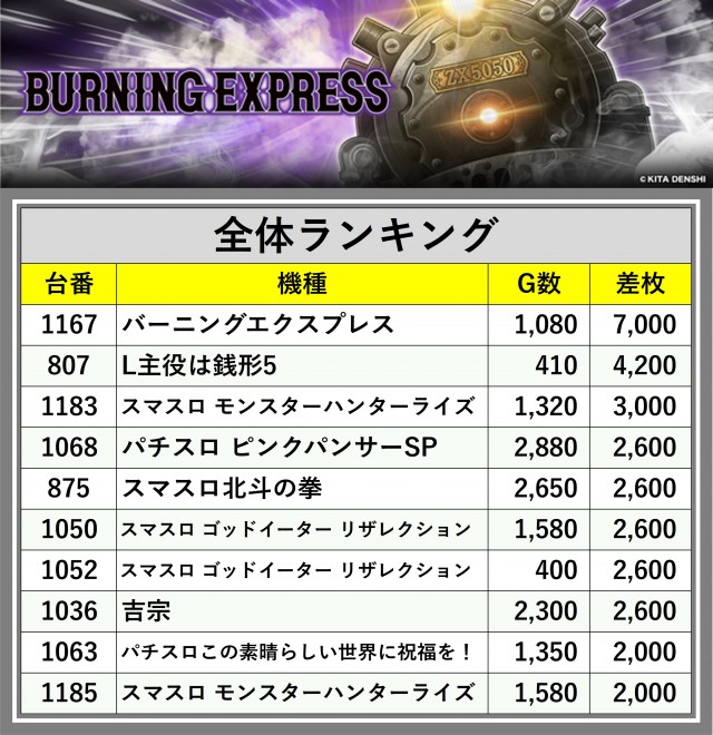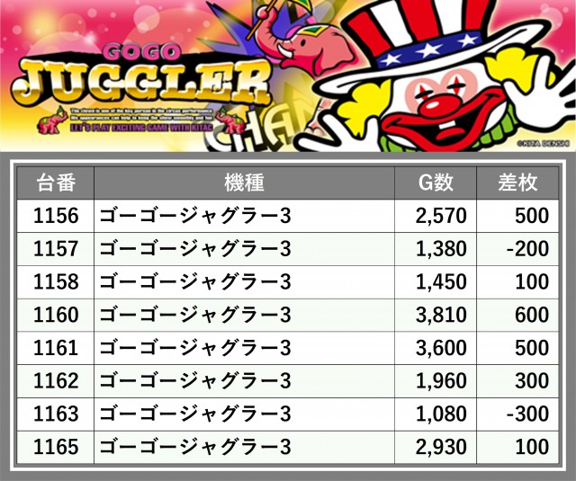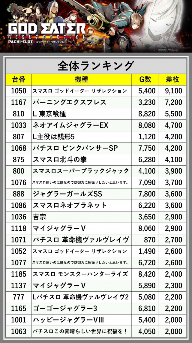 厳選された取材対象機種をはじめ、その他スロット全体から好記録が飛び出した!プレイヤーが楽しんだ1日を下記データにて振り返ってみて欲しい。