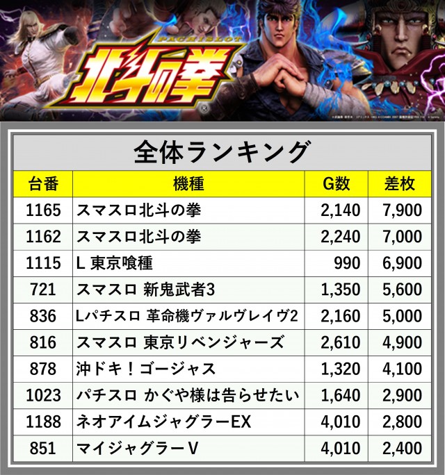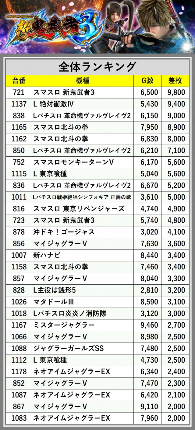 厳選された取材対象機種をはじめ、その他スロット全体から好記録が飛び出した!プレイヤーが楽しんだ1日を下記データにて振り返ってみて欲しい。