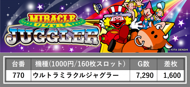 厳選された取材対象機種をはじめ、その他スロット全体から好記録が飛び出した!プレイヤーが楽しんだ1日を下記データにて振り返ってみて欲しい。