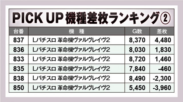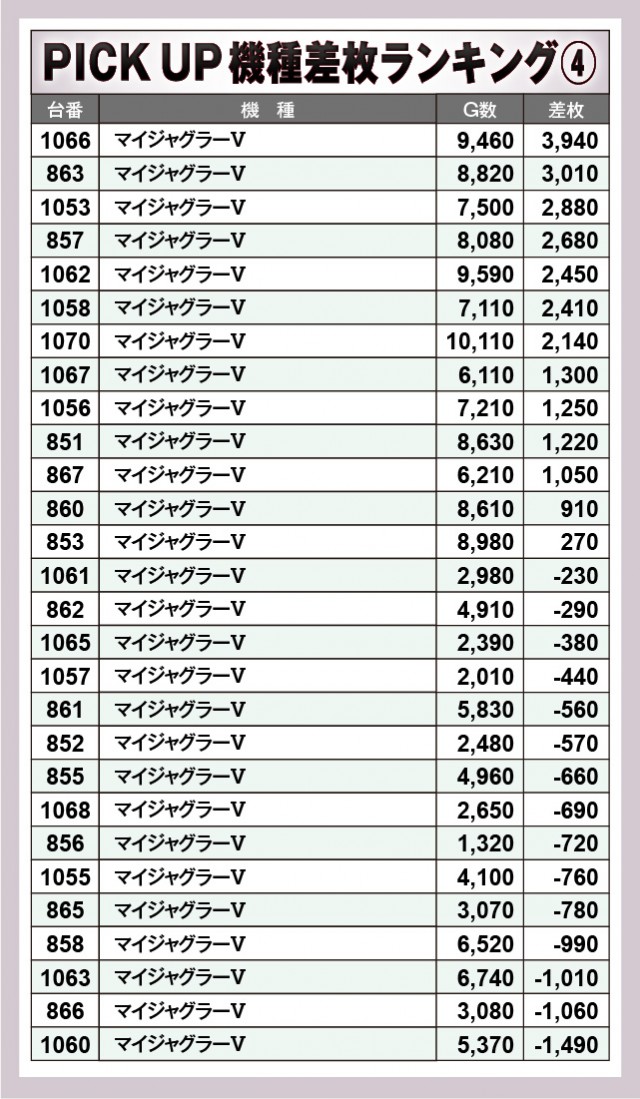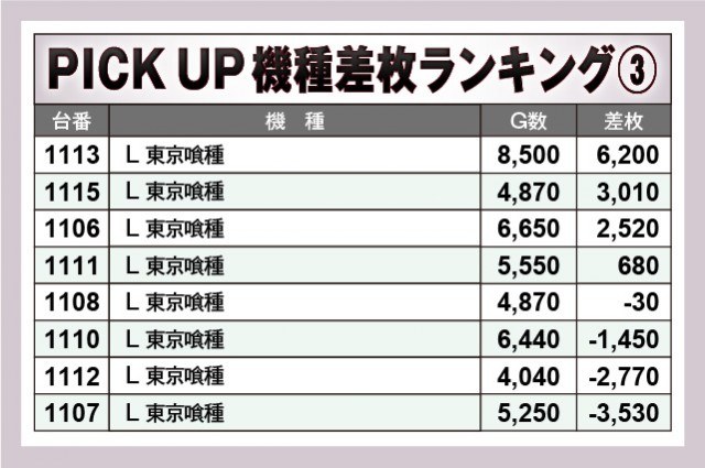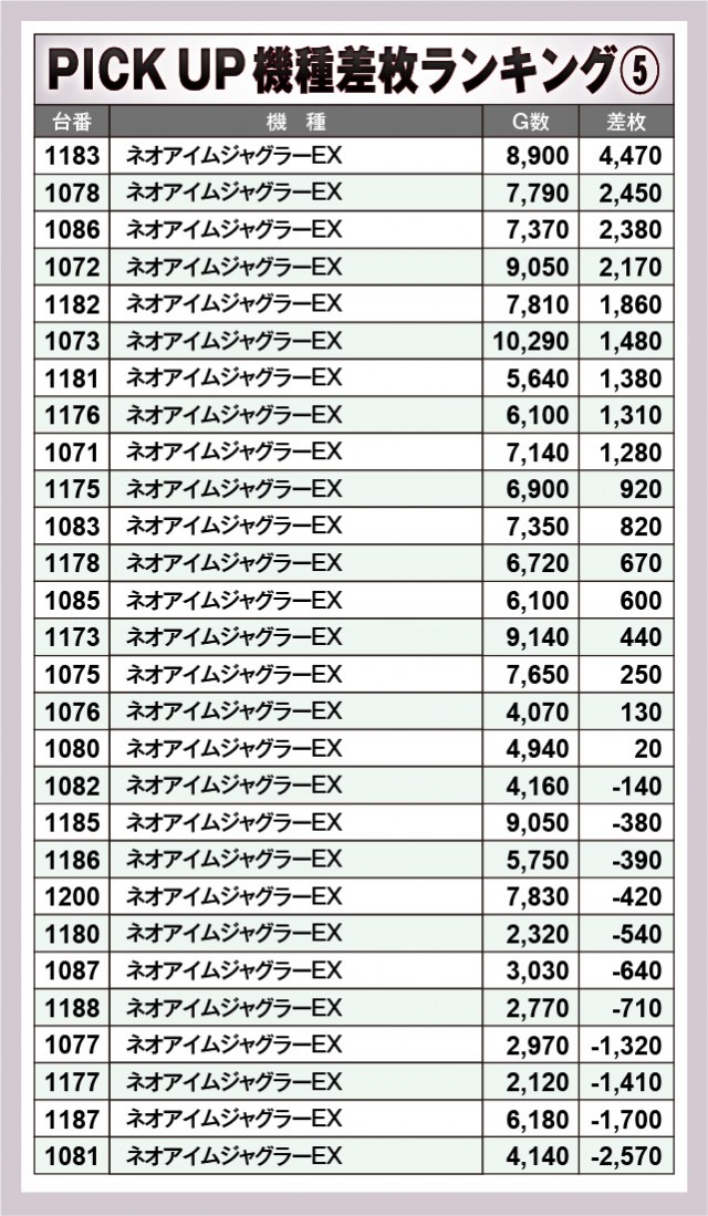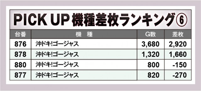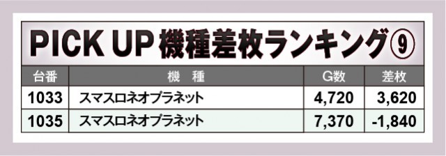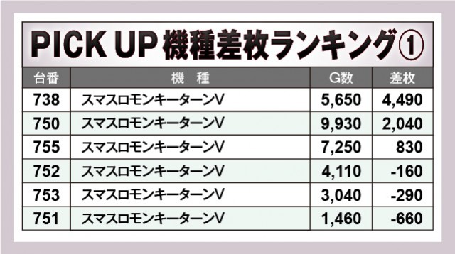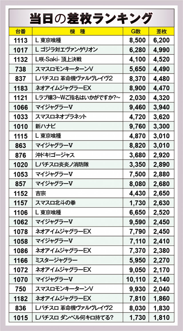 『スマスロモンキーターンV』『Lパチスロ 革命機ヴァルヴレイヴ2』『L 東京喰種』など、人気機種は半数以上でプラス差枚数を達成していた。さらに前述したように、『マイジャグラーⅤ』『ネオアイムジャグラーEX』もコンスタントに大当りを積み重ね、『沖ドキ!ゴージャス』や『新ハナビ』なども熱気を放っていたのが鮮烈だ。スペック問わず幅広い機種が活躍した1日で、ファンは大きな満足感を得たに違いない。