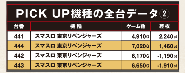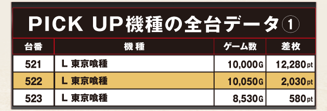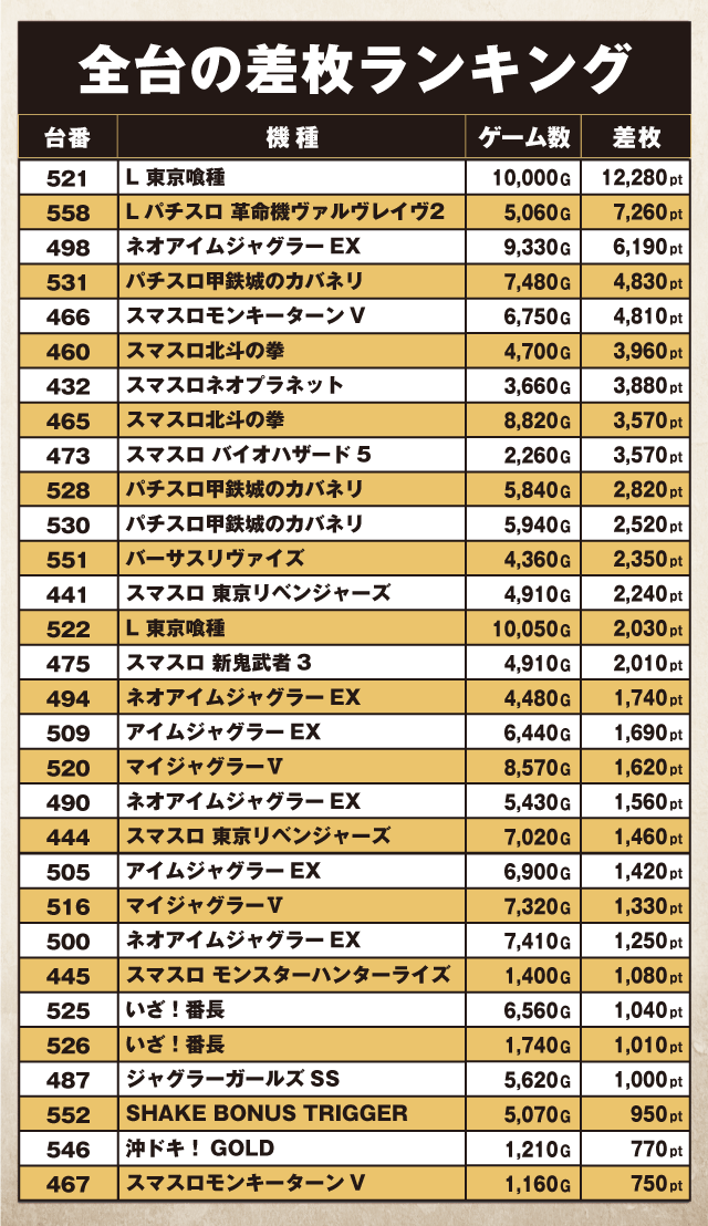 『L 東京喰種』521番台が12,000ptを超えるハイスコアでトップに輝き、『Lパチスロ 革命機ヴァルヴレイヴ2』558番台が続いた。また3、4位には『ネオアイムジャグラーEX』や『パチスロ甲鉄城のカバネリ』が登場。スマスロだけでなくコインマシンも好成績を残す、バラエティに富んだランキング構成となった。