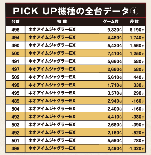 ノーマルタイプながら+6,190ptを獲得しランキング3位となった498番台を始め、9台がプラス差枚となった。