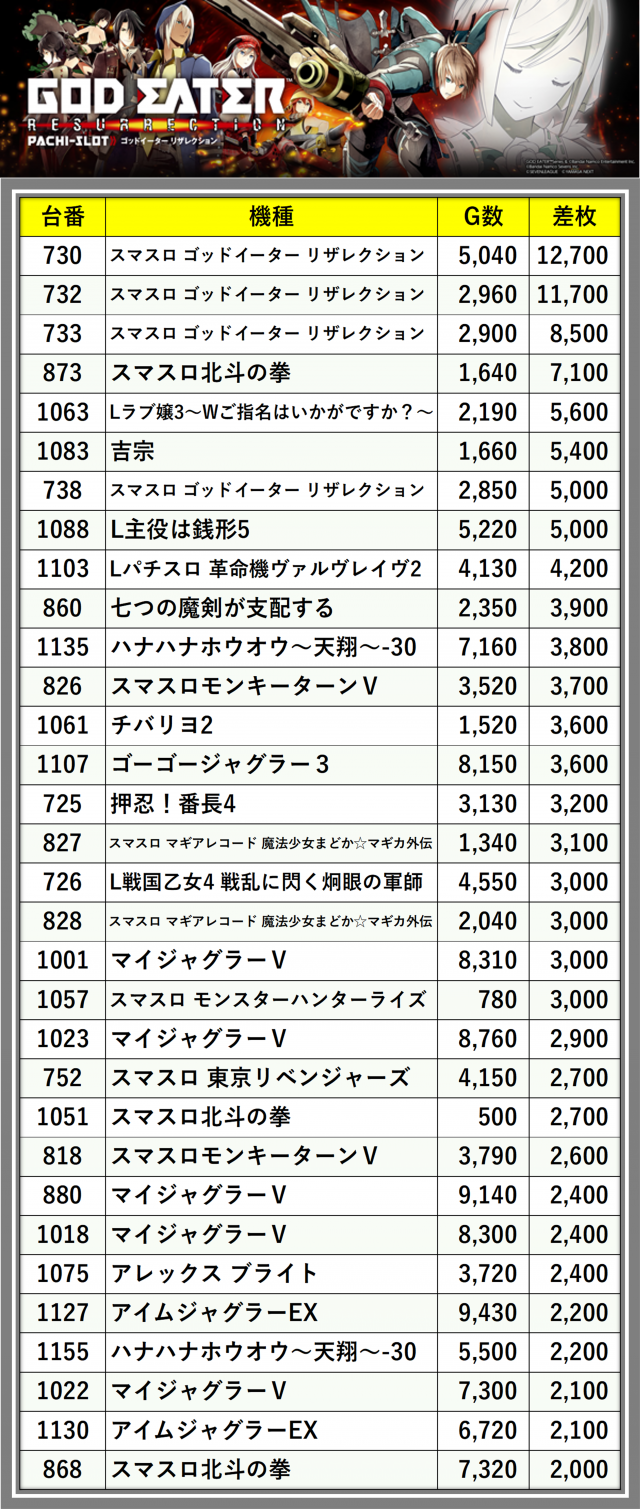 厳選された取材対象機種をはじめ、その他スロット全体から好記録が飛び出した!プレイヤーが楽しんだ1日を下記データにて振り返ってみて欲しい。