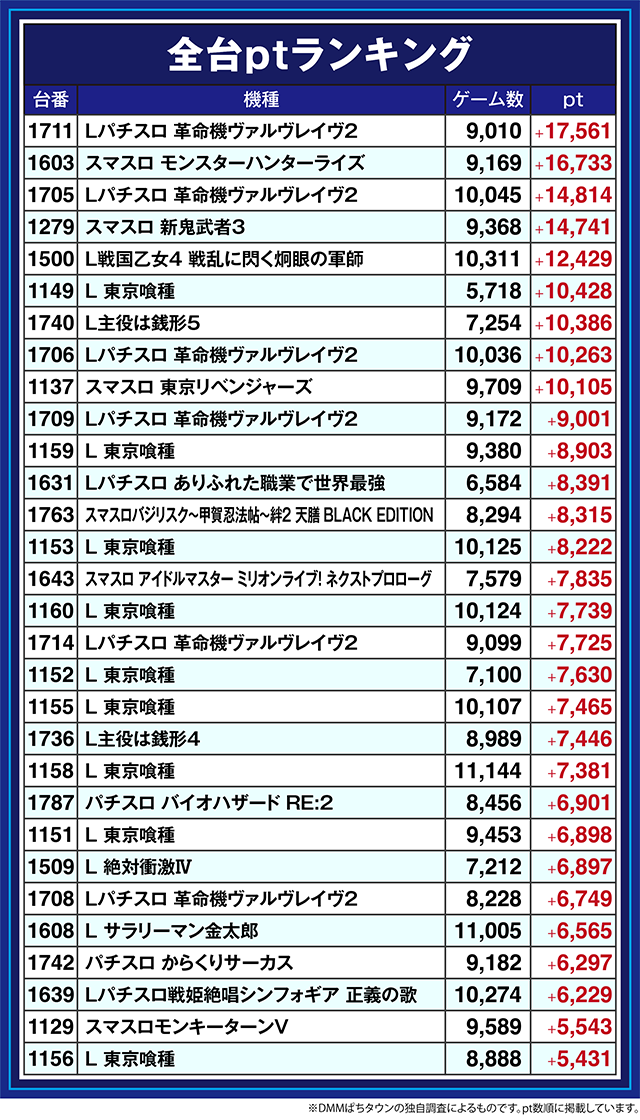 +8,900ptを超えた1159番台など、多くの台が+7,500ptを上回った。