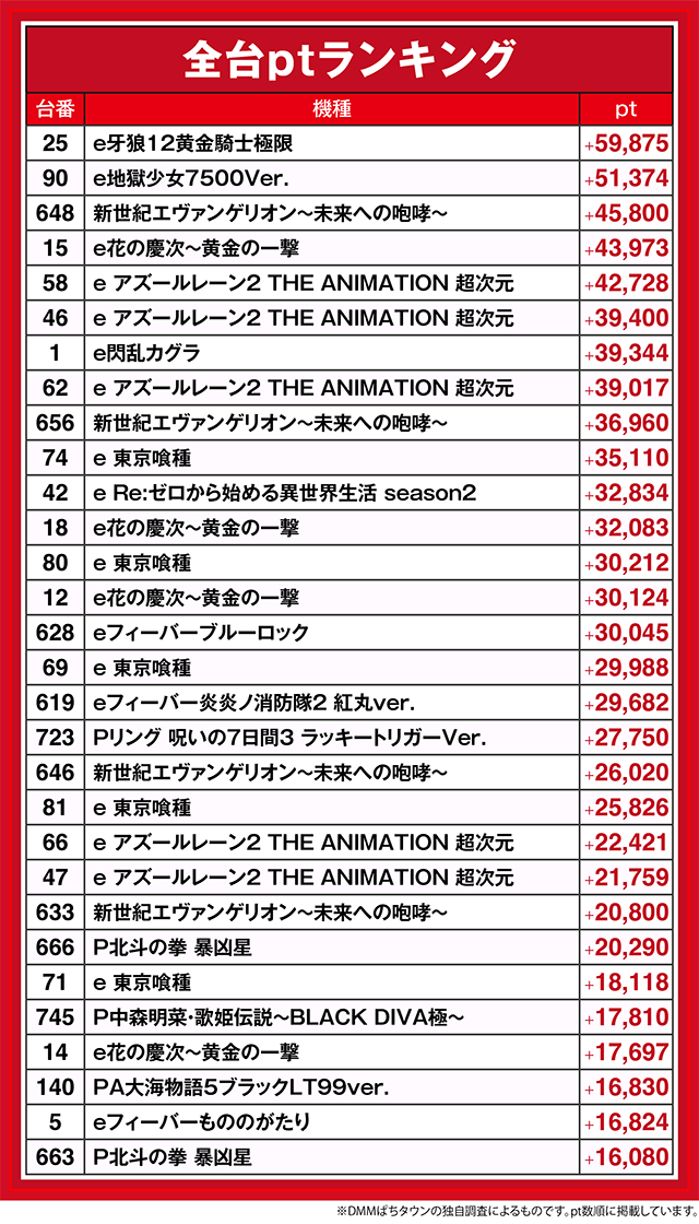 「e花の慶次~黄金の一撃」の15番台や「e アズールレーン2 THE ANIMATION 超次元」の58番台も42,000pt以上と、多くの台が好結果となった。