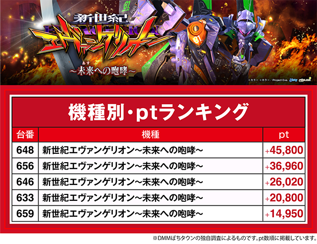 4台が20,000ptを超えた「新世紀エヴァンゲリオン~未来への咆哮~」では、648番台が45,800pt。