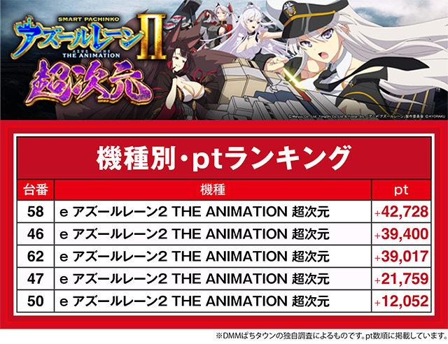 「e アズールレーン2 THE ANIMATION 超次元」も多くの台が+12,000ptを上回り、58番台は+42,728ptを記録した。