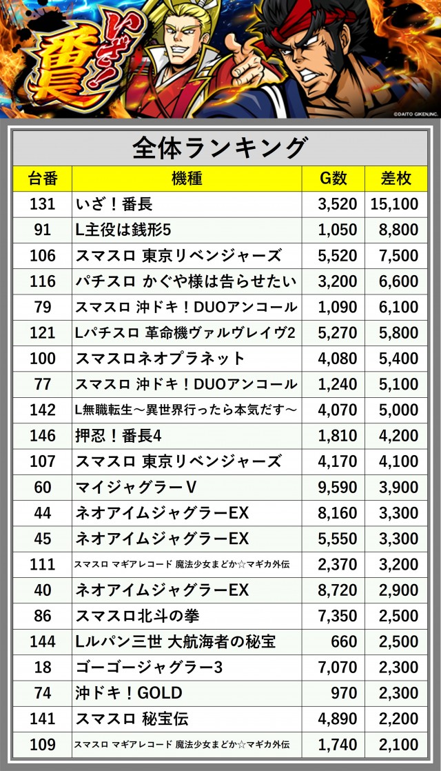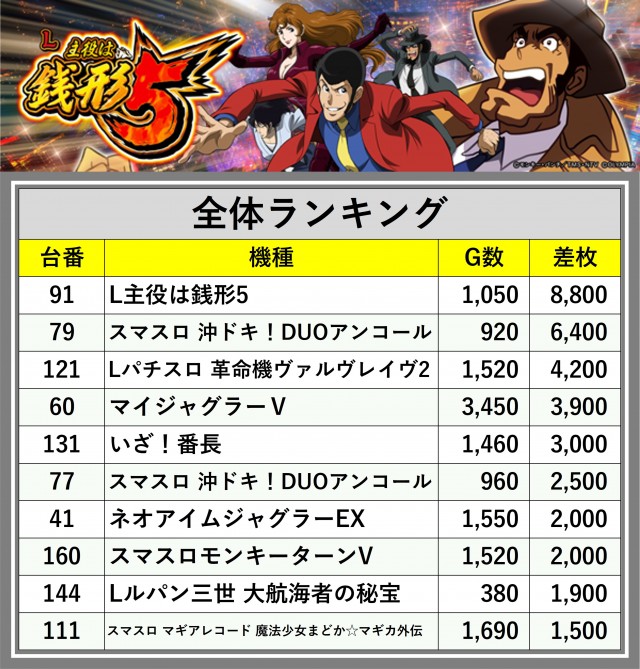 ※差枚数順に掲載しています