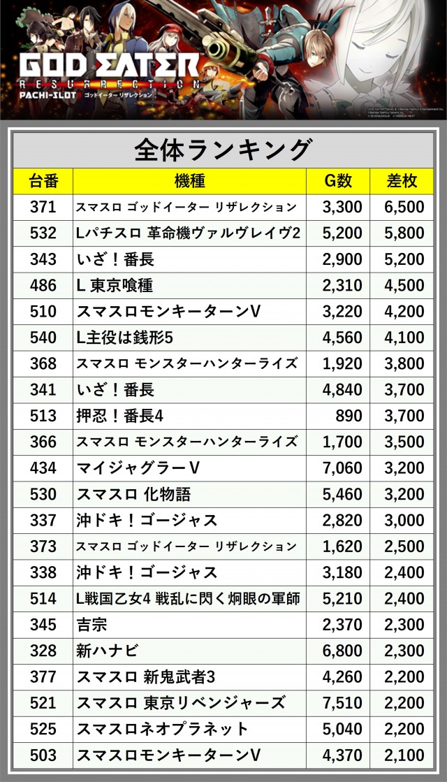 ※差枚数順に掲載しています