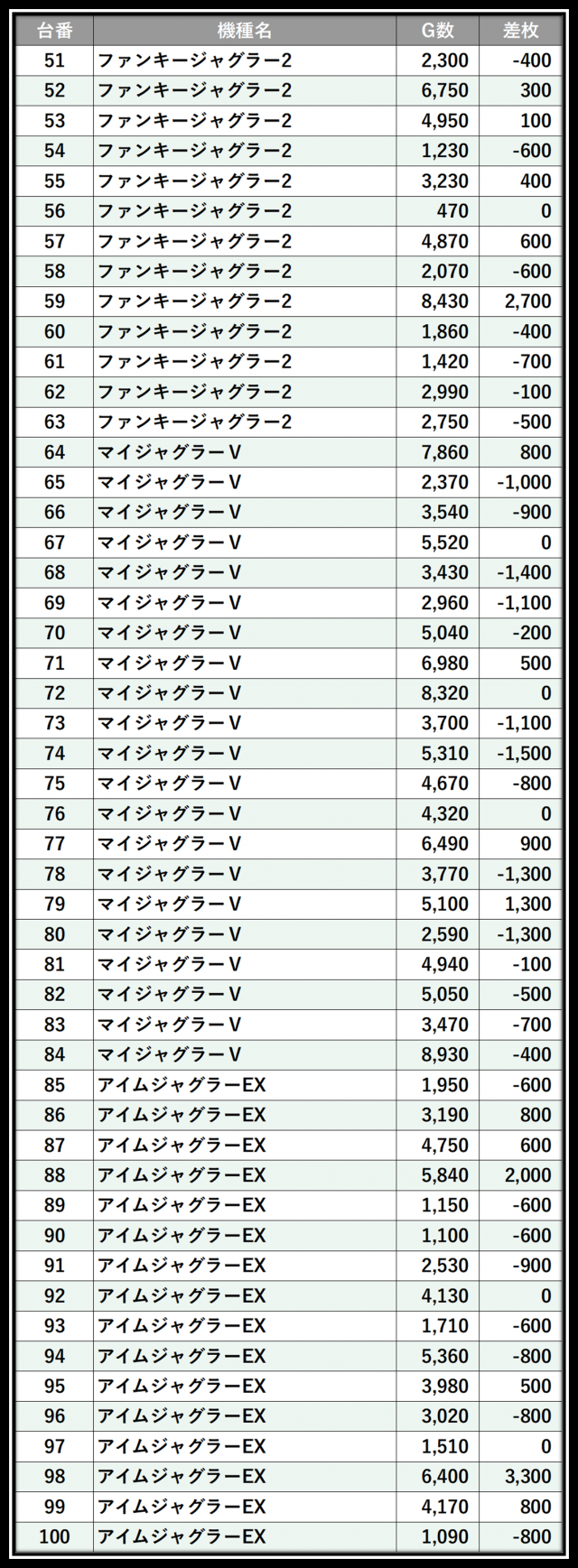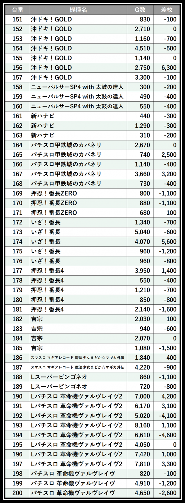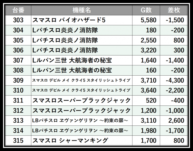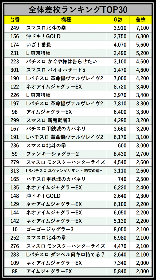 ※差枚数順に掲載しています