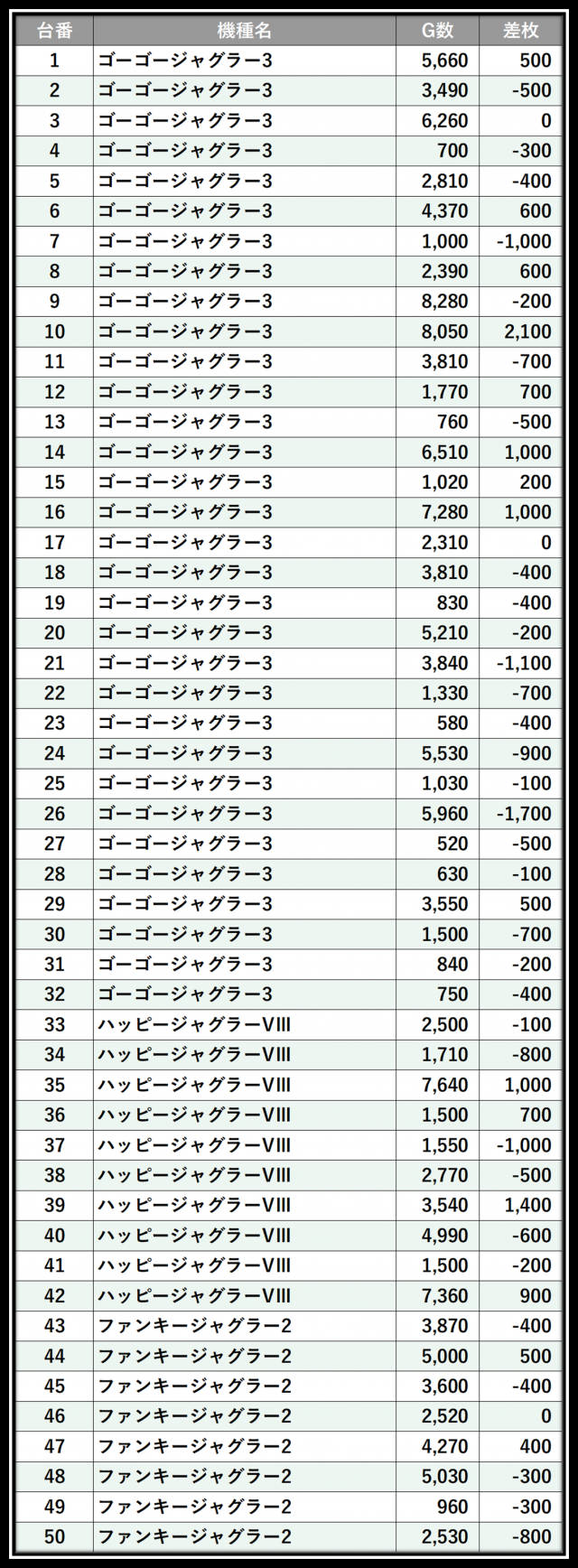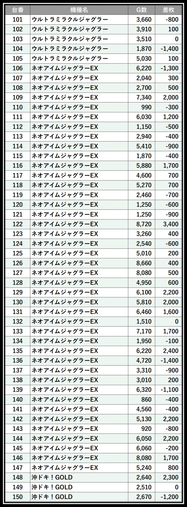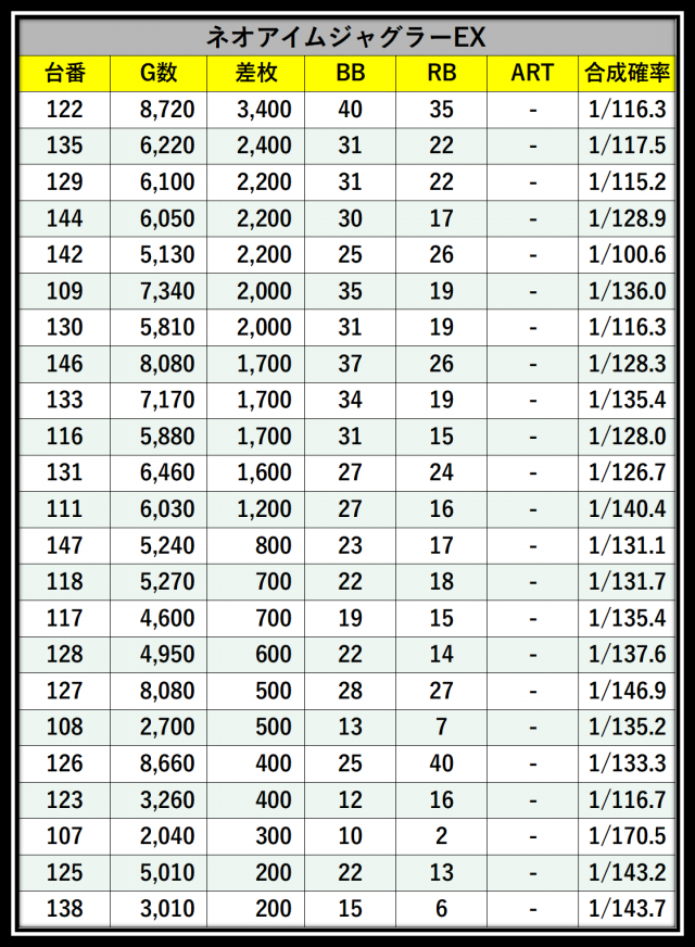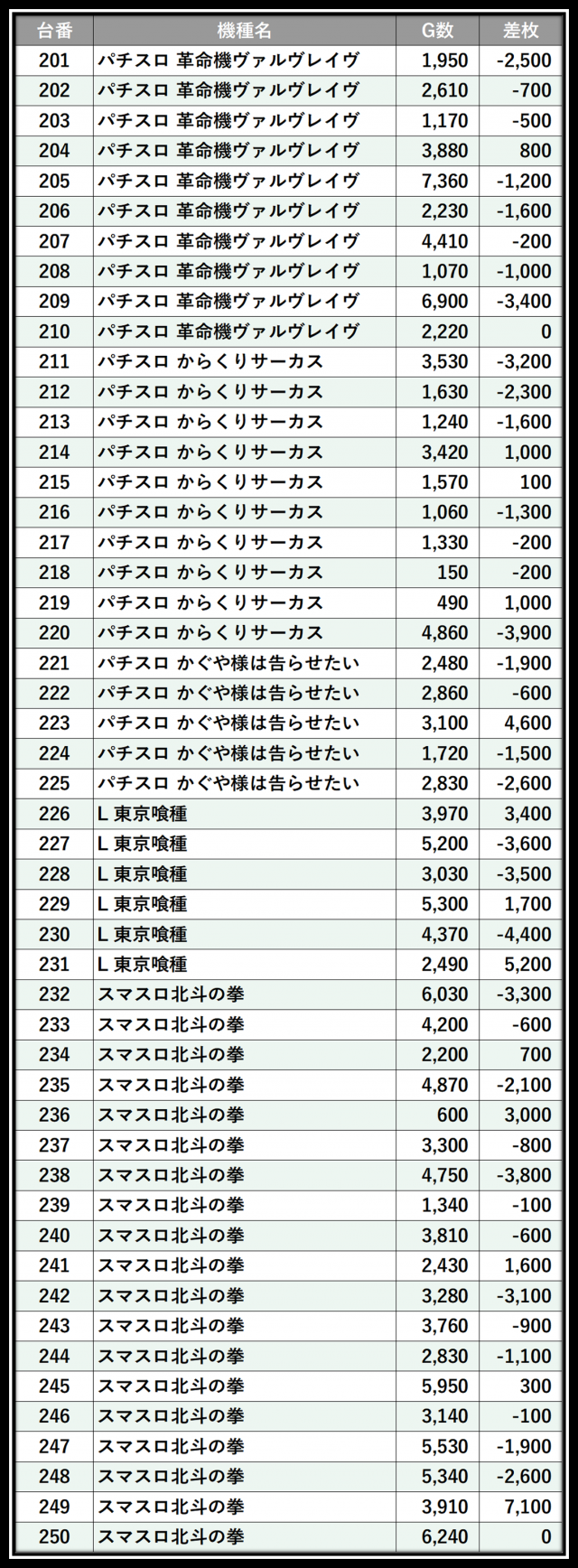 ※差枚数順に掲載しています