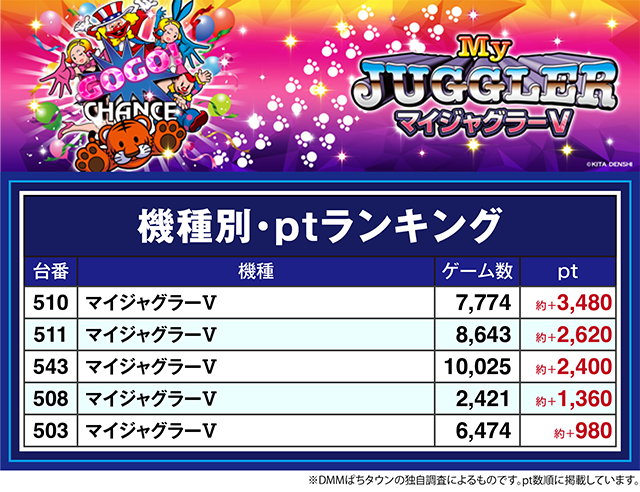 「マイジャグラーⅤ」の510番台が約+3,480pt!