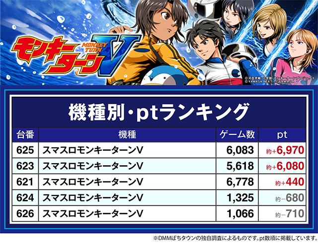 2台が約+6,000ptを超えた「スマスロモンキーターンV」では、625番台が約+6,900ptオーバー。