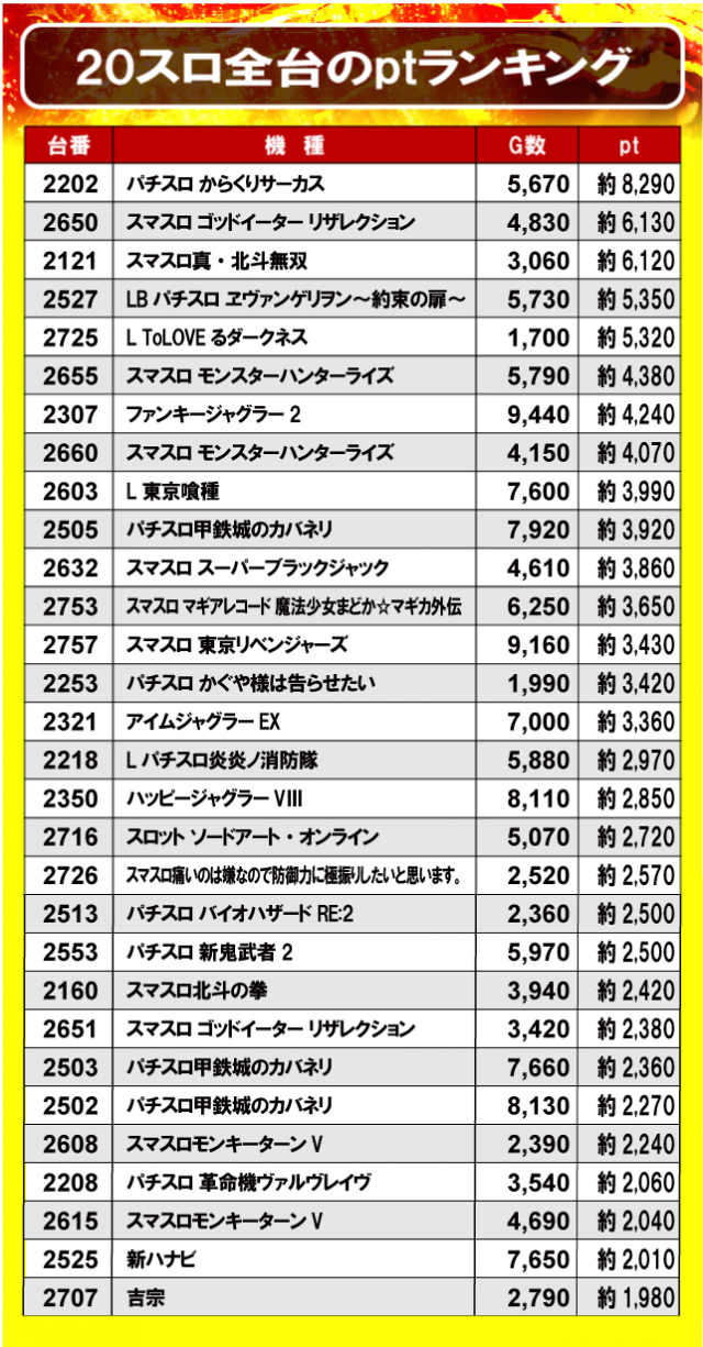 ①20スロ全台のptランキング