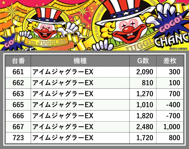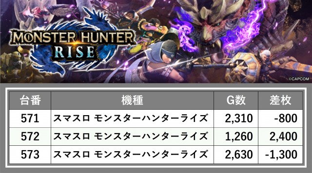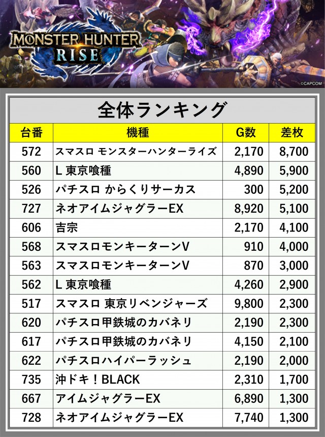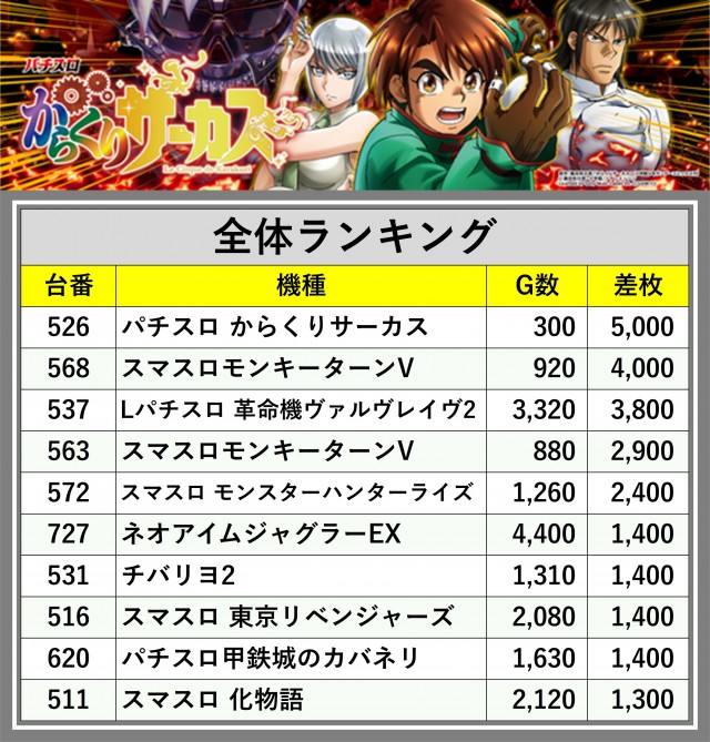 厳選された取材対象機種をはじめ、その他スロット全体から好記録が飛び出した!プレイヤーが楽しんだ1日を下記データにて振り返ってみて欲しい。