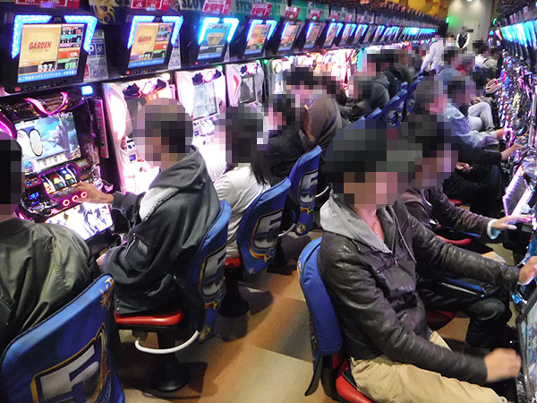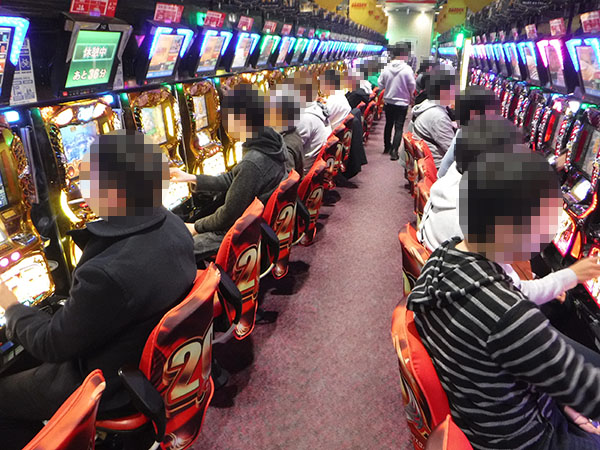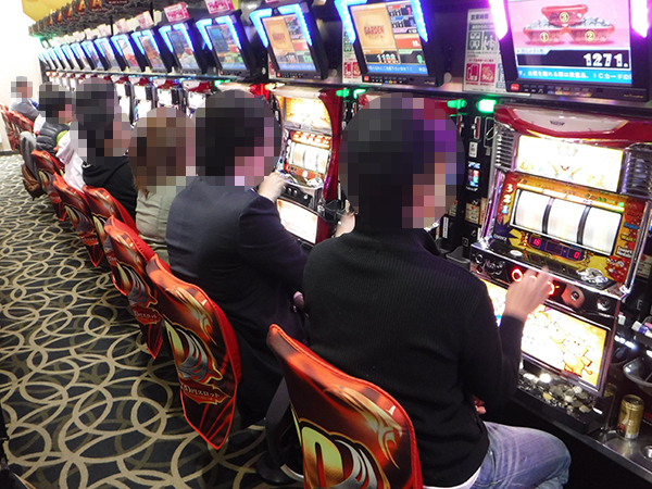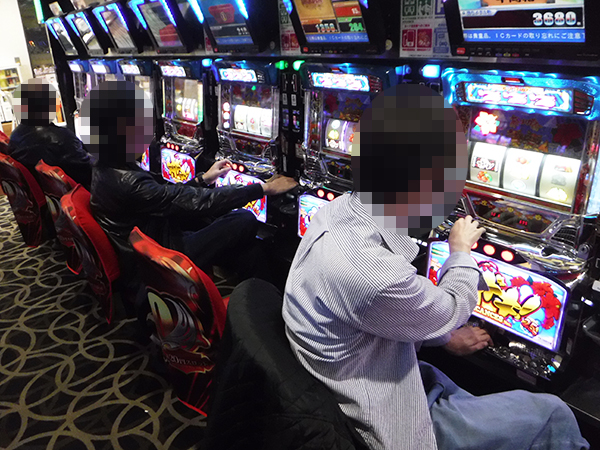 「パチスロ聖闘士星矢 海皇覚醒」や「沖ドキ!」のシマでも満足気な表情を見せるプレイヤーが多数。シマ全体に華やかな光景が広がっていた。