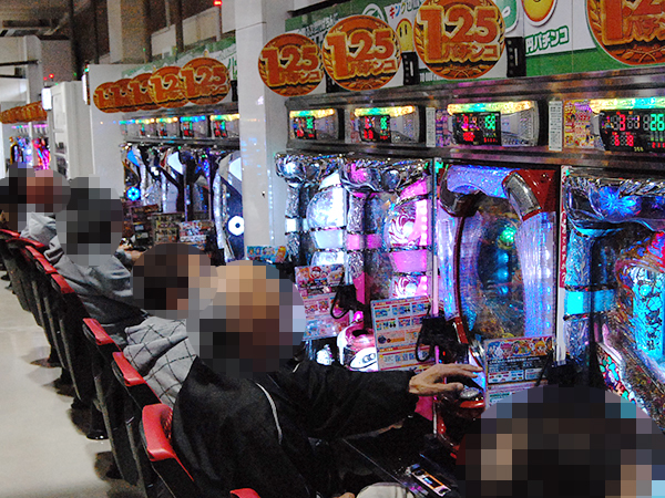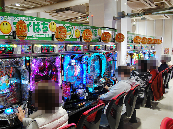 1.25円パチンコは全体的に高稼働。特に海物語シリーズの人気は高く、空き台を見つけるのがやっとだった。