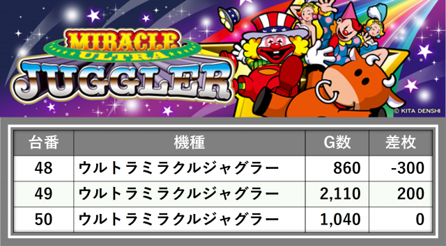 厳選された取材対象機種をはじめ、その他スロット全体から好記録が飛び出した!プレイヤーが楽しんだ1日を下記データにて振り返ってみて欲しい。