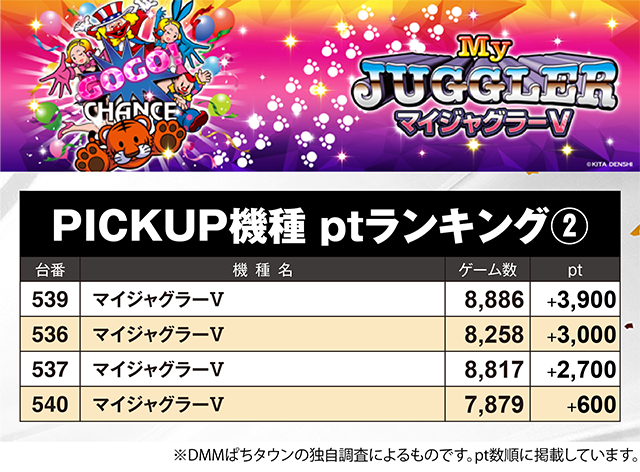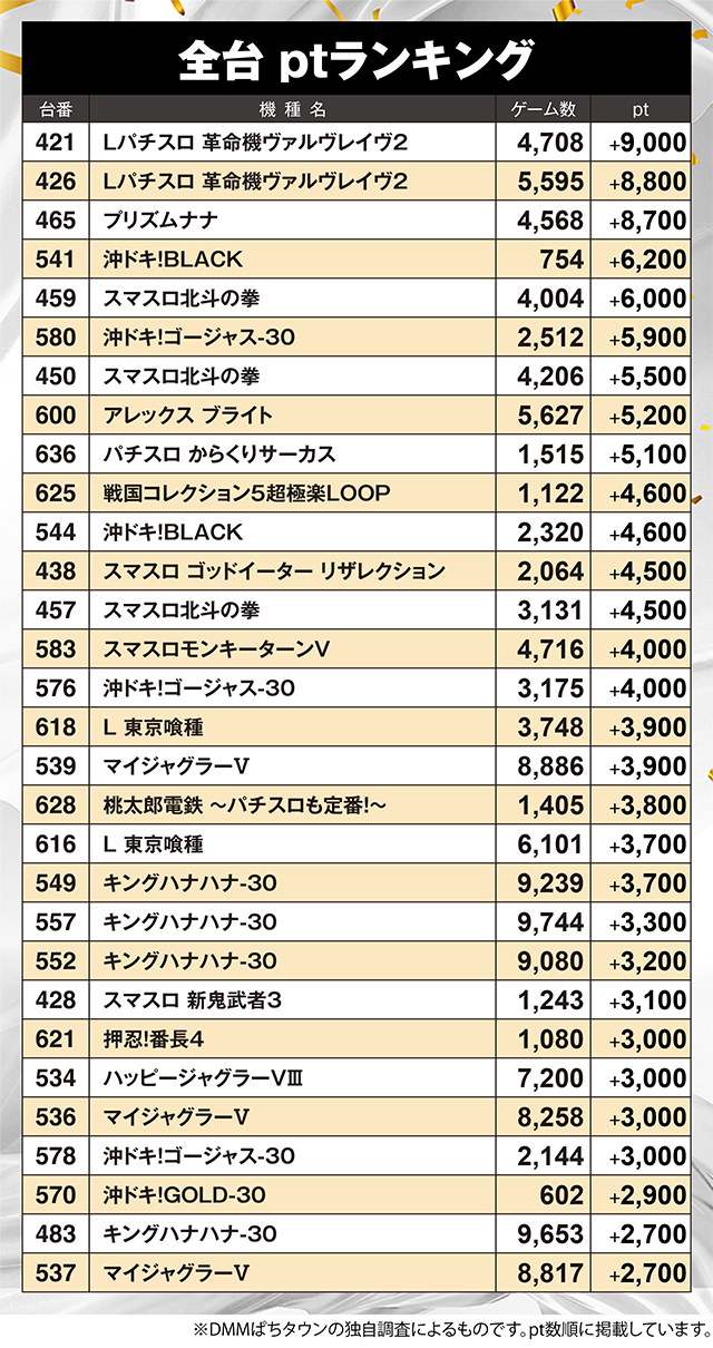ほかにも、「沖ドキ!BLACK」の541番台や「スマスロ北斗の拳」の459番台が+6,000pt以上を記録した。